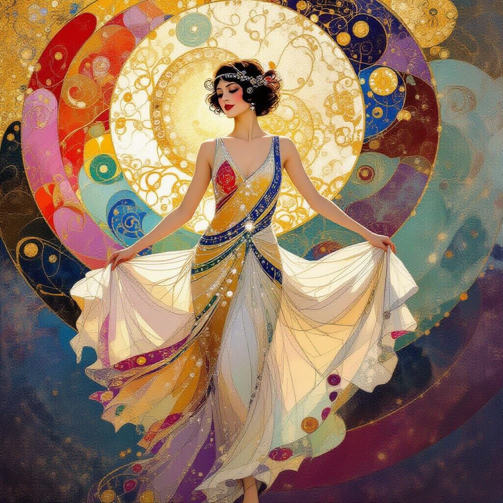 A stunning image of a showgirl in a flapper dress that blends into a cosmic galaxy of swirling colors. The image is rendered with soft brushstrokes and golden accents in an art nouveau style.
