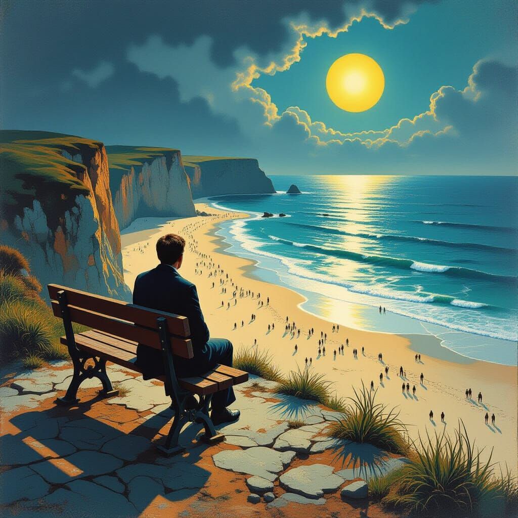 This image shows a solitary figure on a cliff edge, observing a vast beach with many people. It features a vibrant, high-contrast palette and dramatic lighting, evoking a sense of isolation in a surrealist aesthetic.