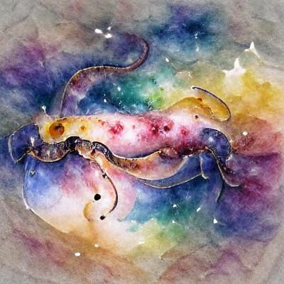 A watercolor painting of the Ophiuchus constellation against a backdrop of deep space. The artwork evokes a sense of wonder through delicate brushstrokes and vibrant celestial hues.