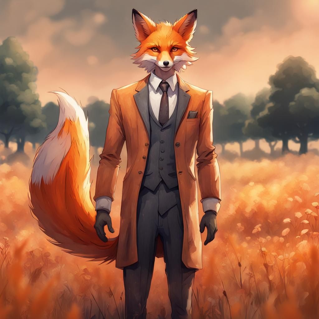 This image shows an orange foxman in a suit standing in a field. The artwork is a detailed matte painting with deep colors and intricate details, rendered in a watercolor style.