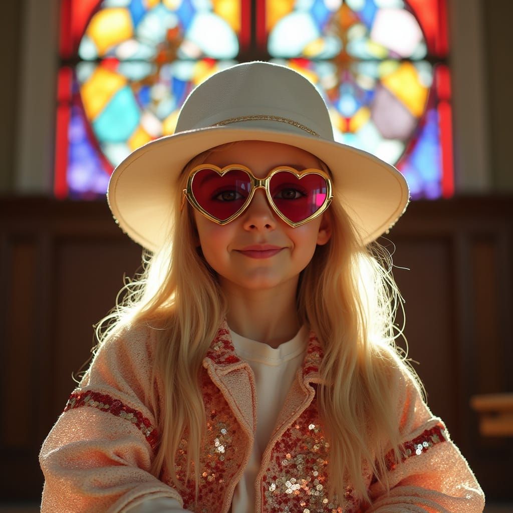 This image shows a young girl with a bright smile, wearing a sequined jacket and hat, standing in a stunning stained glass church with intricate details and vibrant colors, capturing a sense of joyful confidence.