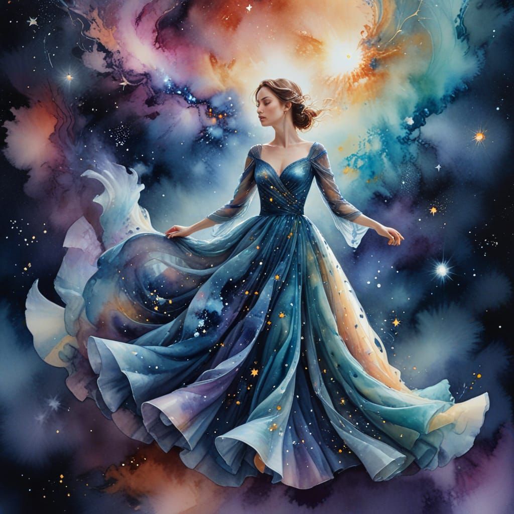 A watercolor painting depicts a woman in an elegant gown transforming into swirling galaxies. Stars and nebulae form the fabric of her dress in this ethereal, otherworldly scene.