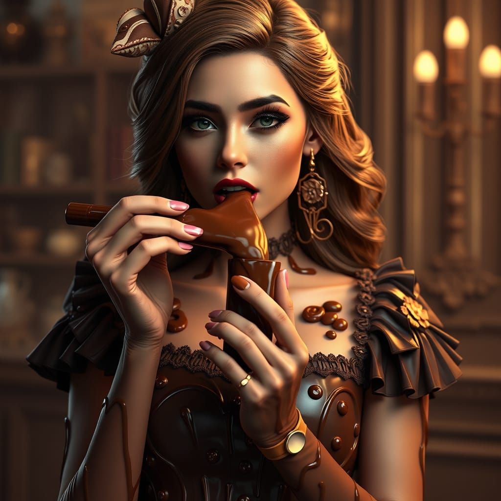 A digital rendering of a woman in a chocolate dress eating chocolate. The image features melting chocolate decorations and dynamic lighting, rendered with intricate detail to achieve a 3D cinematic feel.