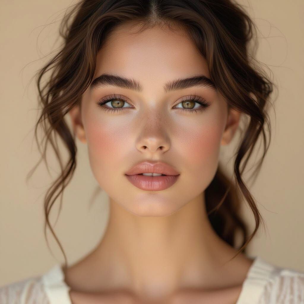 A portrait of a beautiful androgynous Brazilian teenager with golden-brown skin. The subject wears a Y2K-inspired top against a soft beige background, illuminated by warm, soft lighting.