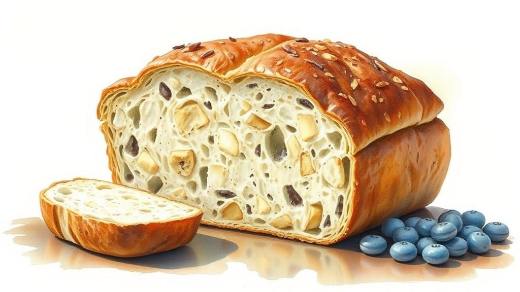 This image depicts watercolor drawings of bread, reminiscent of oil paintings. The artwork captures the textures and tones of various bread types in a painterly style.
