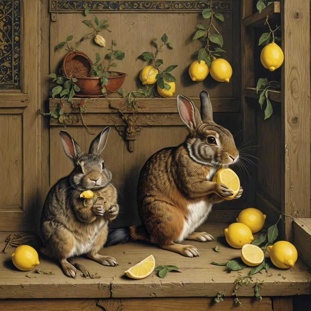 A whimsical image of a rabbit gnawing on a lemon. This artwork evokes the styles of early Netherlandish painting and Russian Nonconformist Art.