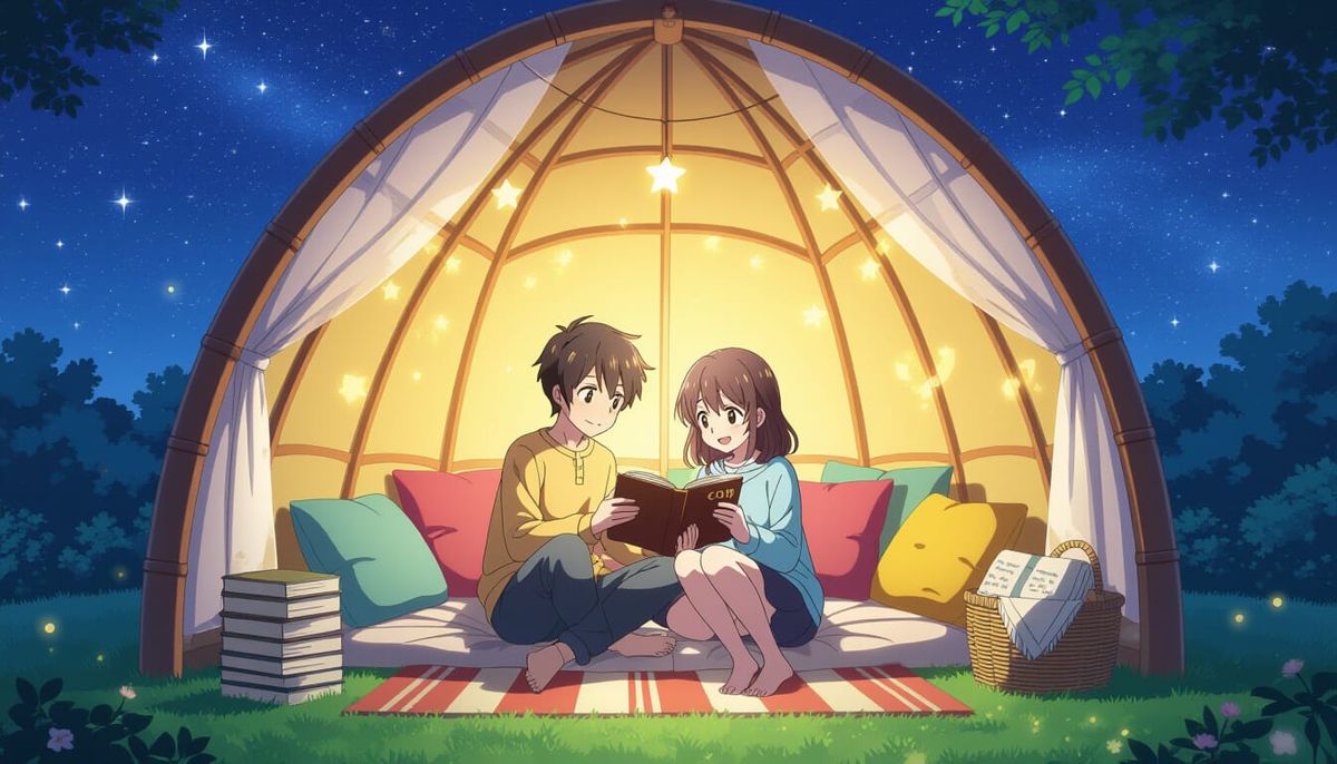 This image depicts a cozy reading nook bathed in starlight, rendered in a manga style. It captures the peacefulness of reading under a starry sky.