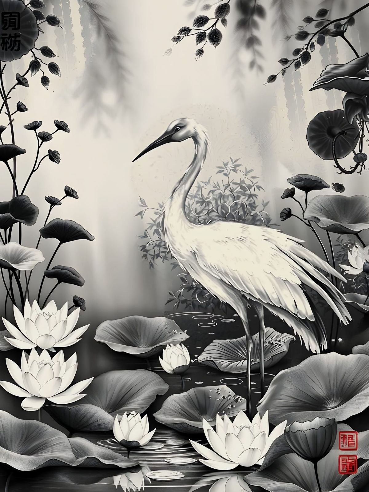 This image showcases two cranes in a lotus pond with flowers and leaves in a traditional Chinese style. The artwork features intricate details reminiscent of Ukiyo-e ink drawings.