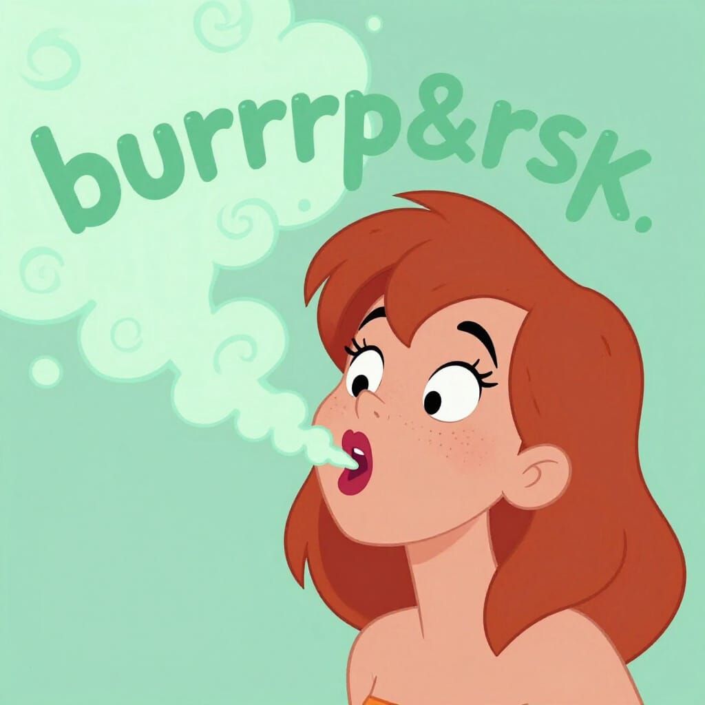 This image shows a cartoon-style portrait of a red-headed woman with freckles, making a surprised and goofy face as she burps. Soft pastel colors and a clean, animated look create a lighthearted and funny scene.