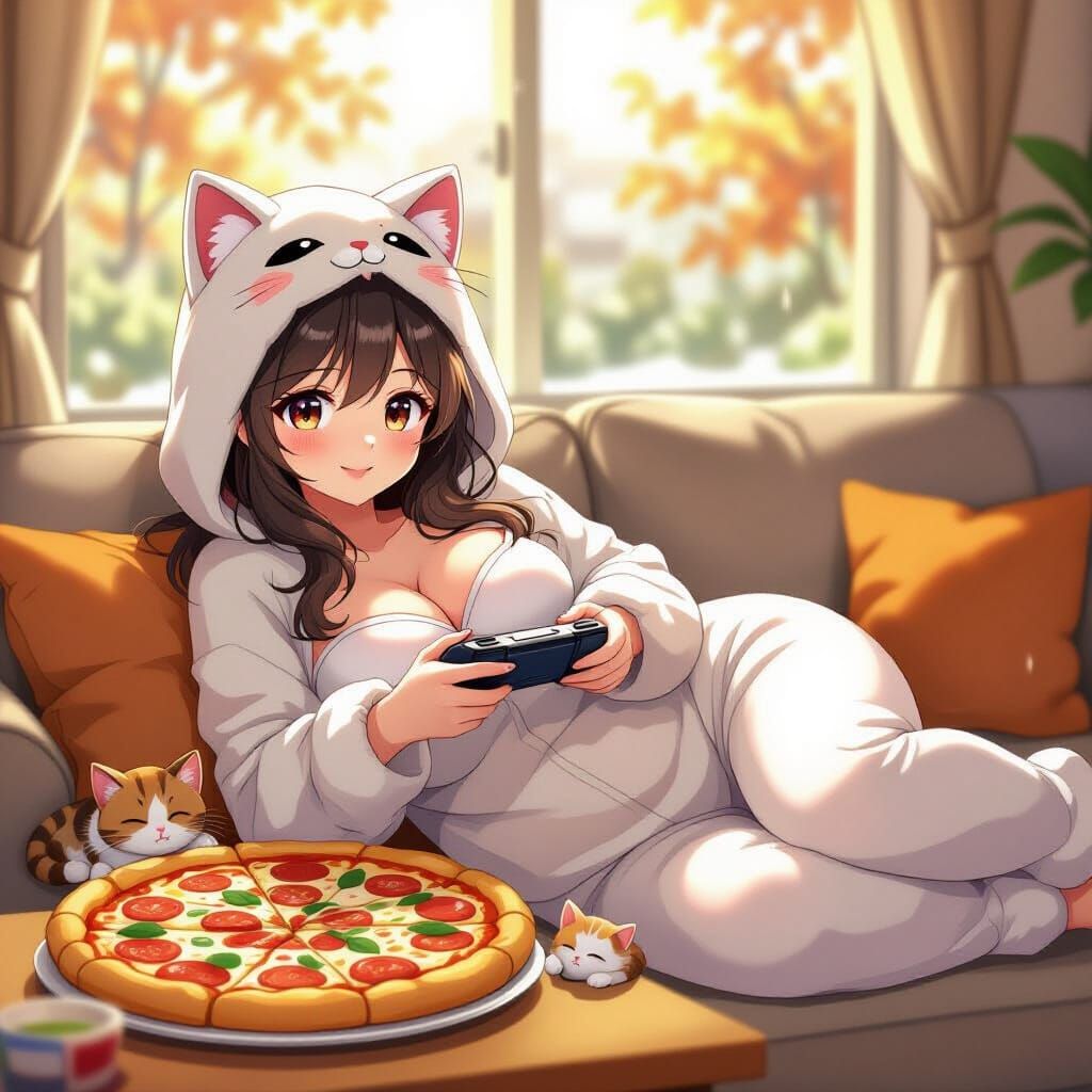 This anime drawing shows a curvy woman in a cat kigurumi relaxing on a couch with a game console, pizza, and a sleeping kitten. The cozy room contrasts with the rainy autumn morning outside.