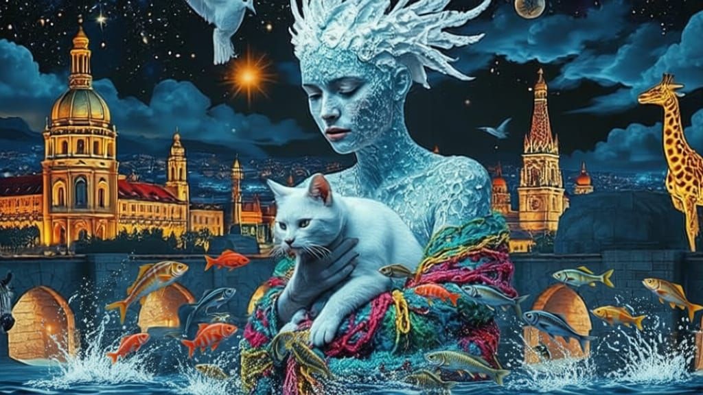 This image shows a woman with a bird's head and bioluminescent skin floating in a vibrant, whimsical cityscape inspired by Antoni Gaudí. Cosmic elements and fantastical creatures fill the scene.