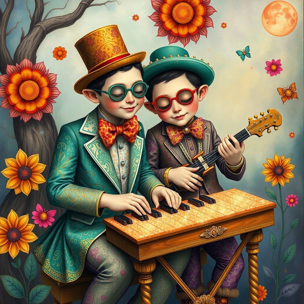 This image shows two brothers playing a duet on a shimmering xylophone in a dreamlike atmosphere, inspired by surrealist art and vibrant folk-art colors.