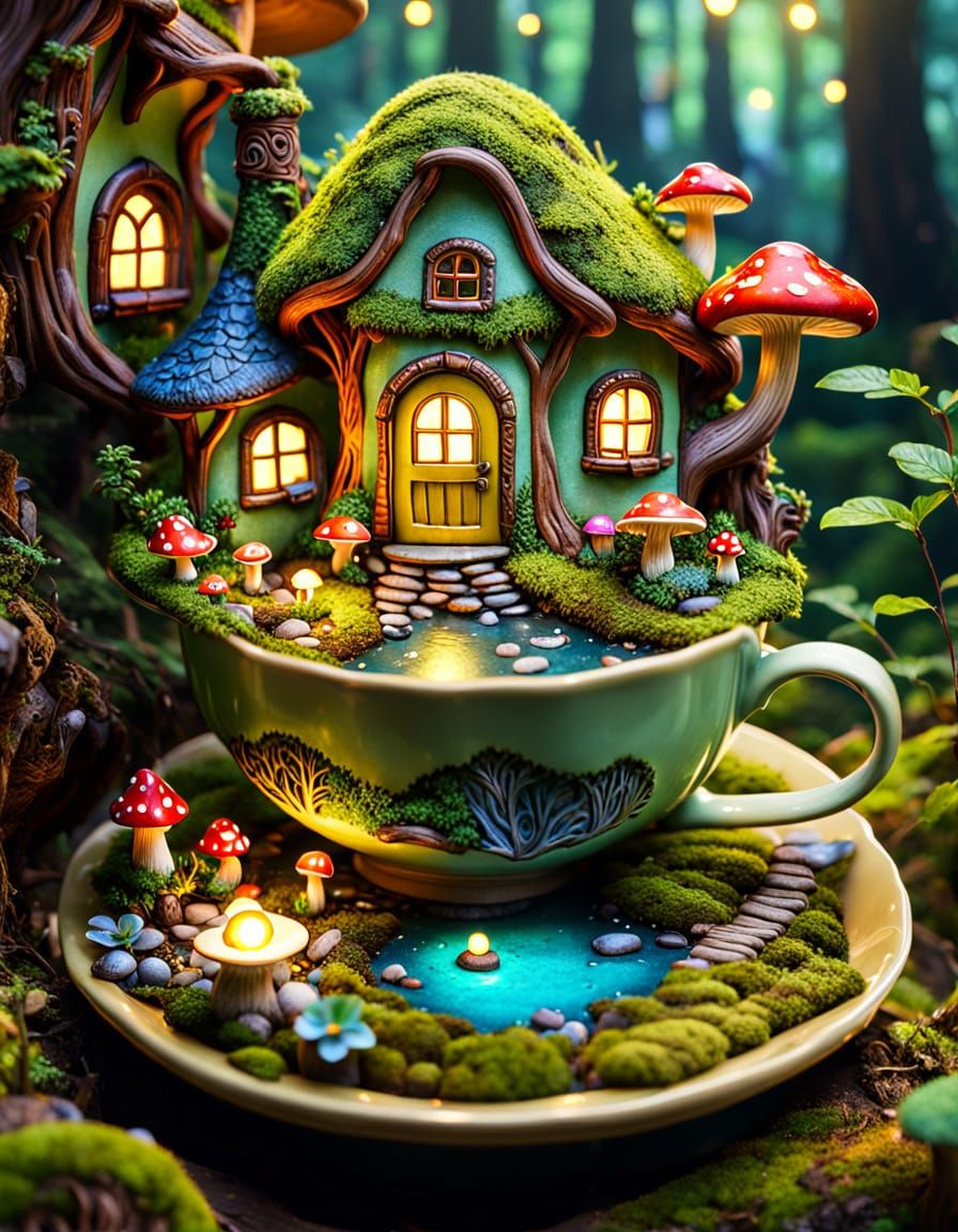 This image shows a miniature pixie village nestled inside a teacup. Mushroom houses with glowing windows line mossy roads in a lush forest, rendered in vibrant colors with warm, golden lighting.