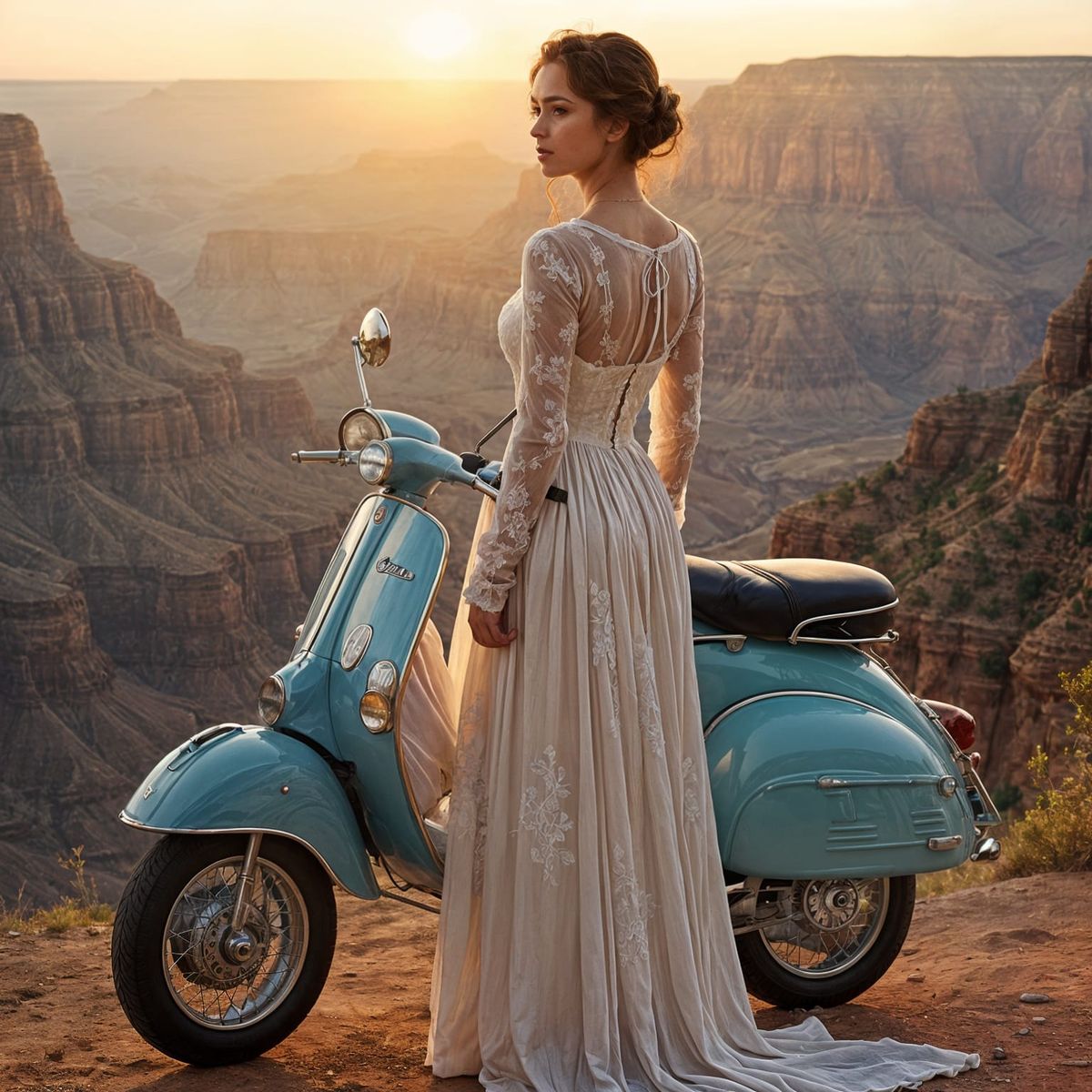 This image captures a refined Victorian woman standing proudly beside her vintage blue and white Vespa, set against the breathtaking backdrop of the Grand Canyon at sunset.