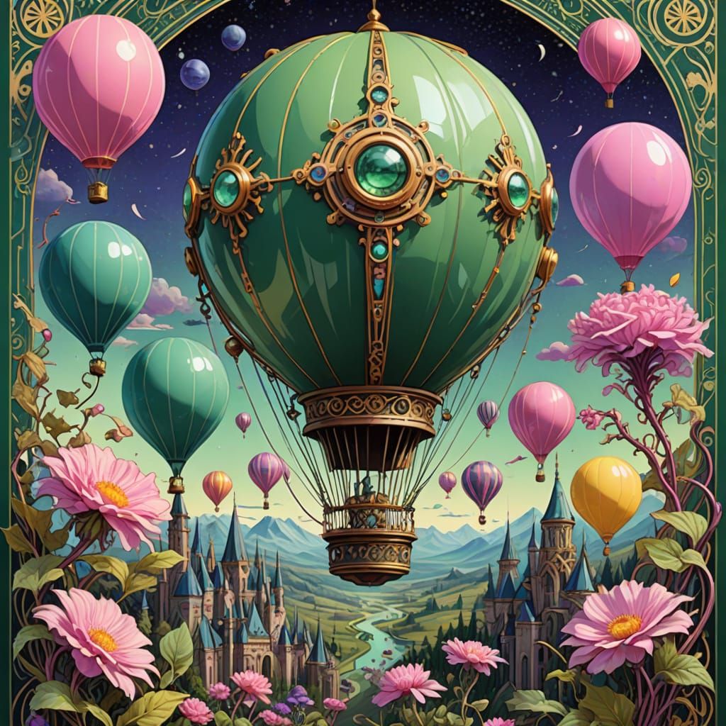A vintage Art Nouveau illustration with surrealist and steampunk elements. The artwork features botanical details, gears, and a flying carousel balloon in a maximalist composition with vivid colors and digital effects.