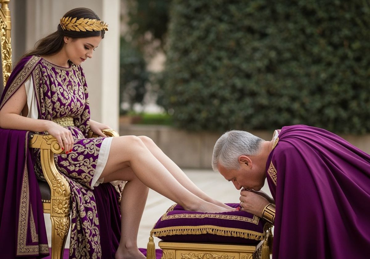 This image shows a Roman Empress on her golden throne as a senator kneels before her. The photograph is highly detailed with natural light and a shallow depth of field.