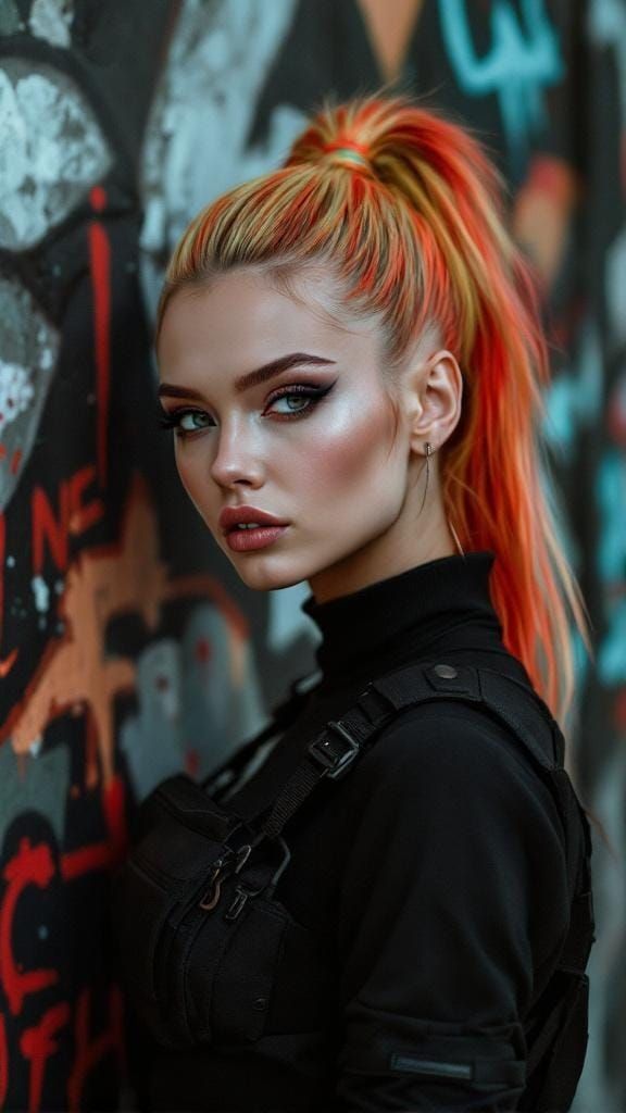 This image shows a woman with striking orange-blonde hair in a high ponytail, wearing black tactical gear. Bold makeup and a grungy graffiti wall enhance the futuristic urban aesthetic, reminiscent of digital art.