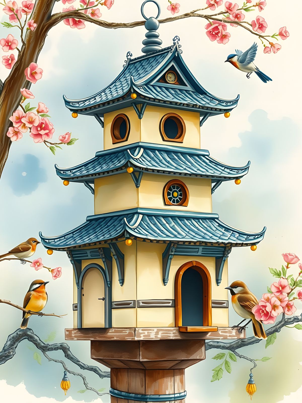 A whimsical impressionistic watercolor of a birdhouse. The birdhouse is designed in the style of a traditional Japanese fortress, rendered with delicate brushstrokes and vibrant colors.
