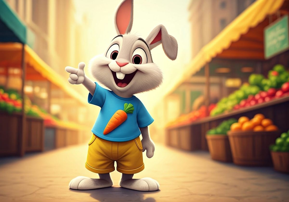 This image shows a cartoon rabbit wearing a carrot t-shirt and yellow shorts, laughing at a city farmer's market. The image is styled as vibrant 3D digital art.