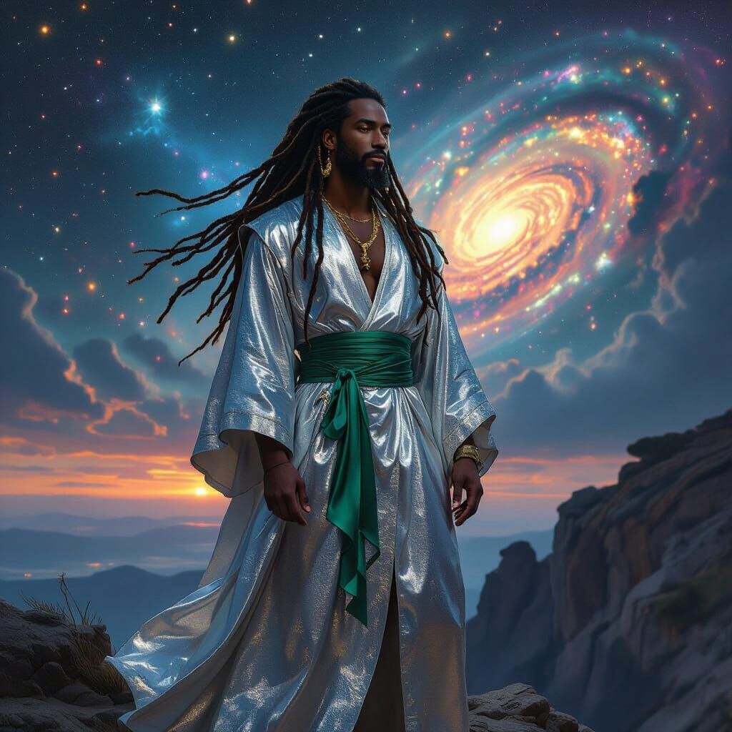 A striking picture of a Black man with dreadlocks wearing a silver robe with a green sash. He stands on a cliff at night with a starry galaxy behind him as hyperrealistic digital art.