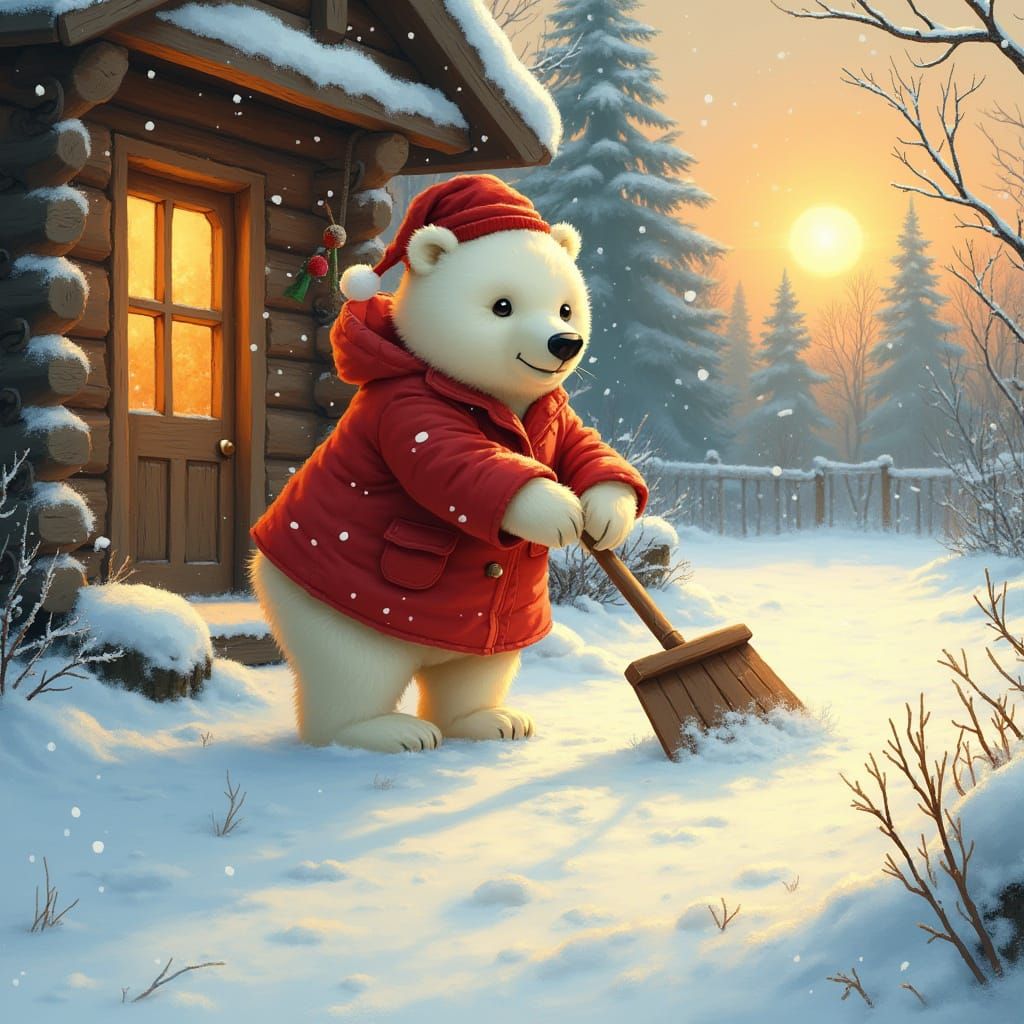 This charming illustration shows a polar bear in a red coat happily shoveling snow at a log cabin. Golden sunset light and falling snowflakes create a warm, storybook scene.