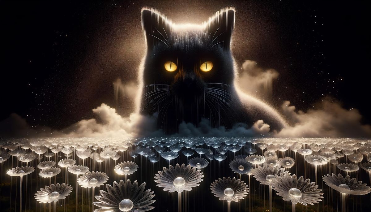 This image shows a surreal double exposure of a black cat over a daisy field. The scene is 3D rendered with dramatic lighting, creating long shadows and highlighting the crystalline glass textures in a high-resolution, 4k display.