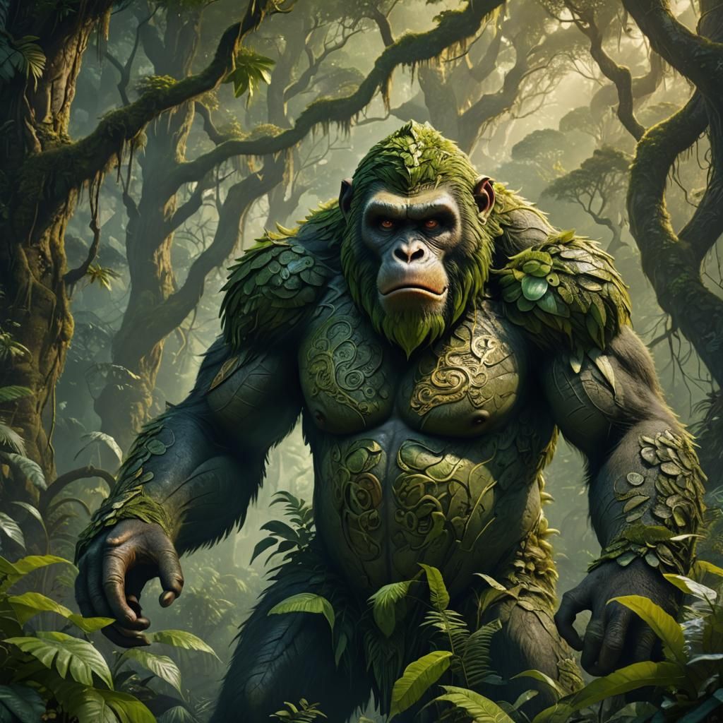 A striking picture of a large monkey-man standing in a forest. The figure has scaly skin, one eye, and wild red hair. Lush foliage, mist, and golden light complete this fantasy illustration.