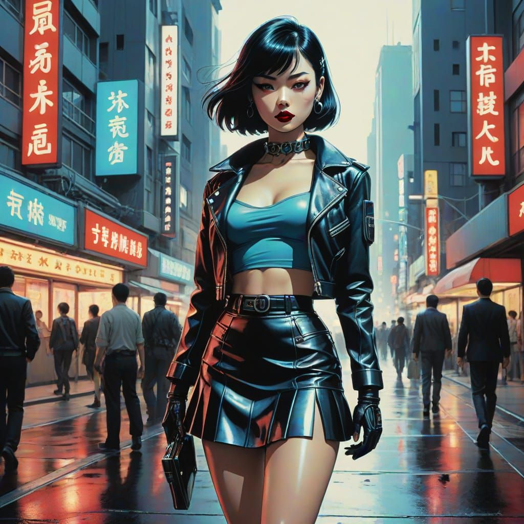 This image shows a 1950s pin-up style woman standing on a busy city sidewalk. The artwork evokes a cyberpunk graphic novel aesthetic with high contrast and tactile realism.