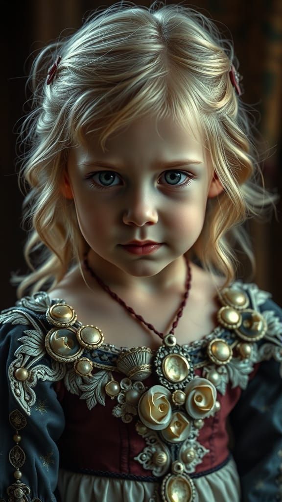 This image is a highly detailed and atmospheric digital painting of a six-month-old blonde girl set in the 18th century, featuring intricate and cinematic elements.