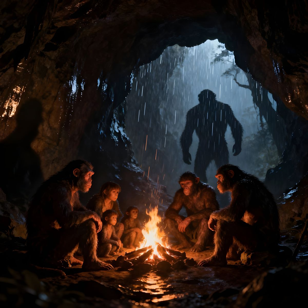 This atmospheric digital painting depicts early humans seeking shelter from a storm around a warm fire inside a cave, rendered with dramatic lighting and deep shadows.