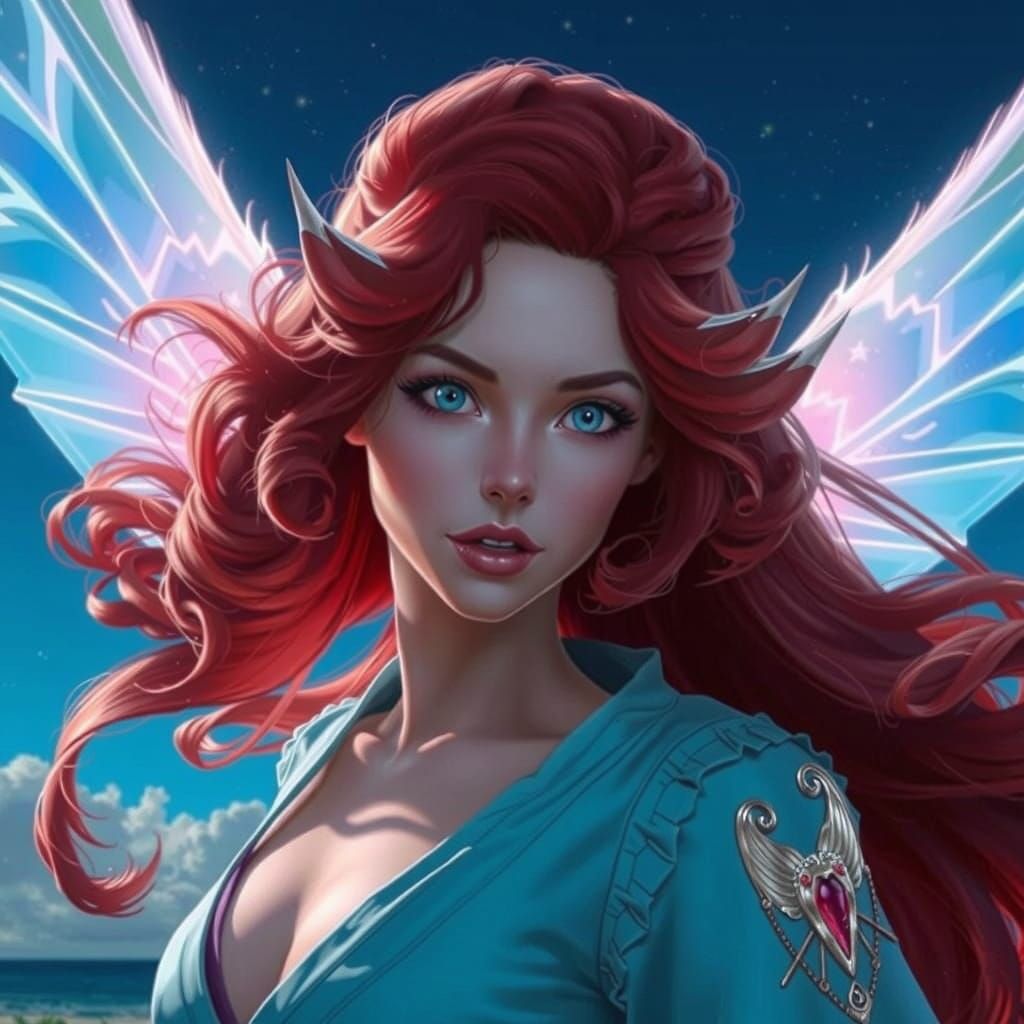 This vibrant image shows a fae-winged vampire with a geisha-like complexion, galaxy-blue eyes, and curly red hair, running on a neon-lit beach in a synthwave-inspired style.