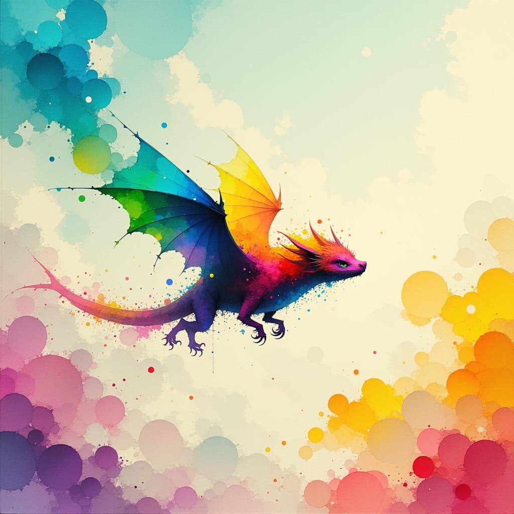 A whimsical image showing a fluffy dragon soaring through a colorful sky, leaving a trail of rainbow confetti. The artwork blends surrealism with vibrant colors, soft realism, and watercolor textures.