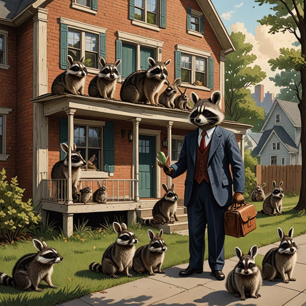 This image depicts a raccoon realtor guiding bunny rabbits through a spacious apartment complex, highlighting its amenities and features.