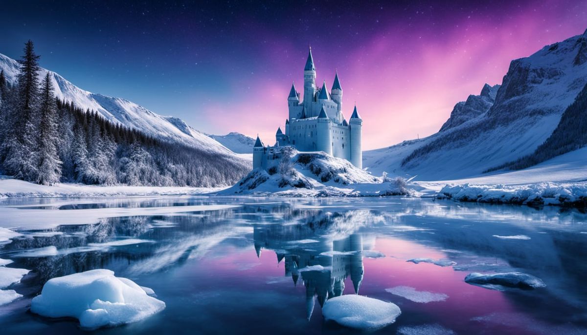 This image captures a serene and peaceful winter scene, with a majestic ice castle under the vibrant colors of the aurora borealis, surrounded by frozen lakes and snow-covered mountains in a breathtaking vista.