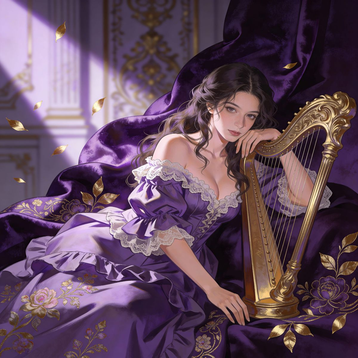 This image showcases a gorgeous, ornate illustration in a sensual baroque style, featuring rich violet hues. A true masterpiece of digital art.