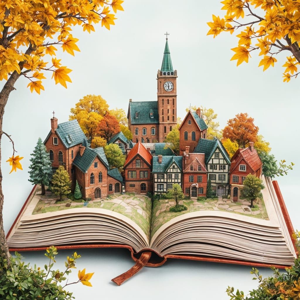 A charming image of a miniature European village displayed on an open book. The town features brick buildings, a church, clock tower, and colorful houses surrounded by lush, autumnal trees.