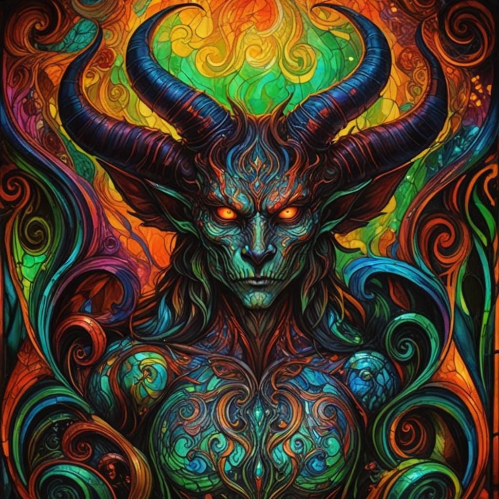 This image features a striking animalistic demon in a fantasy painting style. It incorporates elements of dark horror, ancient myths, and fairytales, rendered with dazzling, iridescent stained glass effects and high contrast.