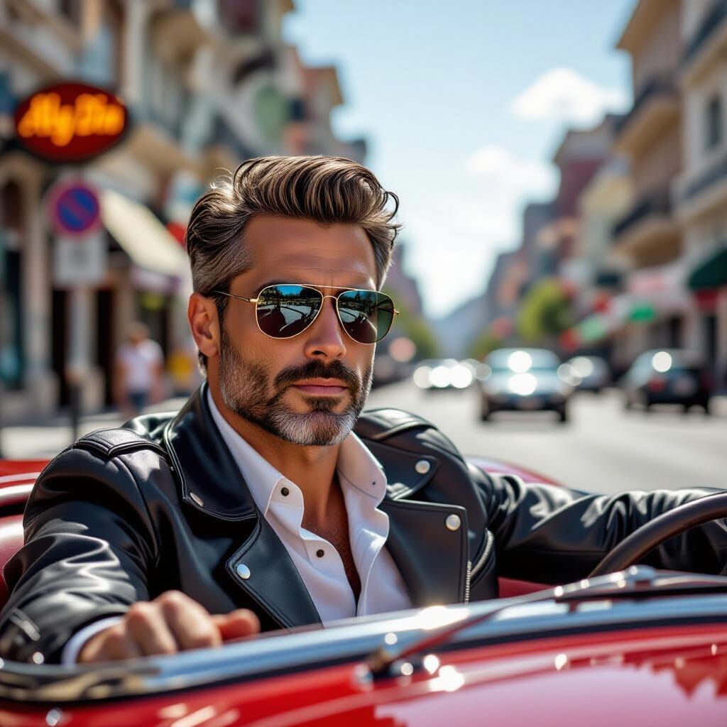 This image shows a Latin man in sunglasses and a leather jacket driving a vintage convertible. The background features a blurred cityscape and signage, rendered in photorealistic style.