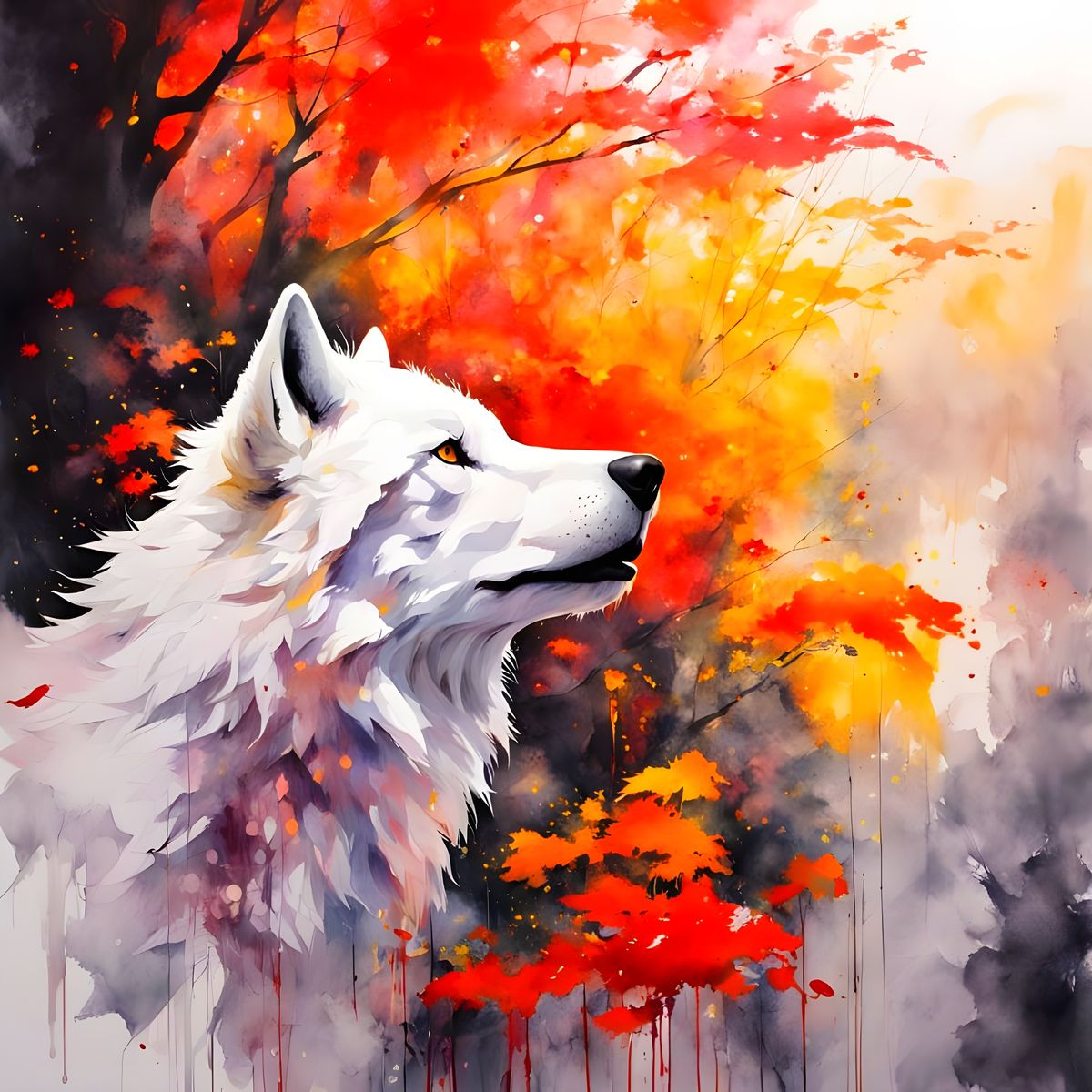 This enchanting image depicts a serene forest scene, where a majestic white wolf roams amidst lush autumn foliage and towering ancient trees. A waterfall cascades in the background, casting a mystical aura.