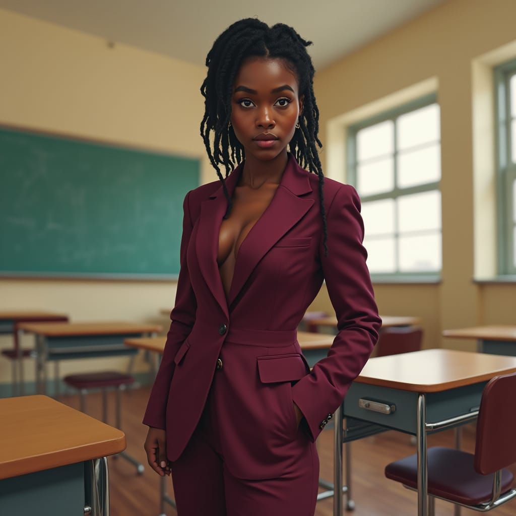 A photorealistic portrait of a Black woman in a burgundy suit, standing in an empty classroom. The artwork uses vibrant colors and detailed textures in a contemporary style.