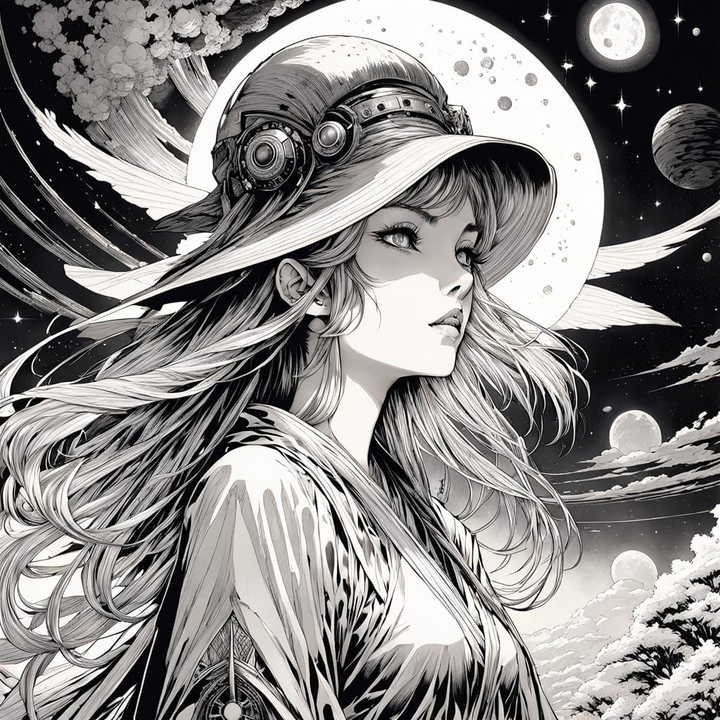 Generate your own unique space witch images in a retro manga style, easily and for free.