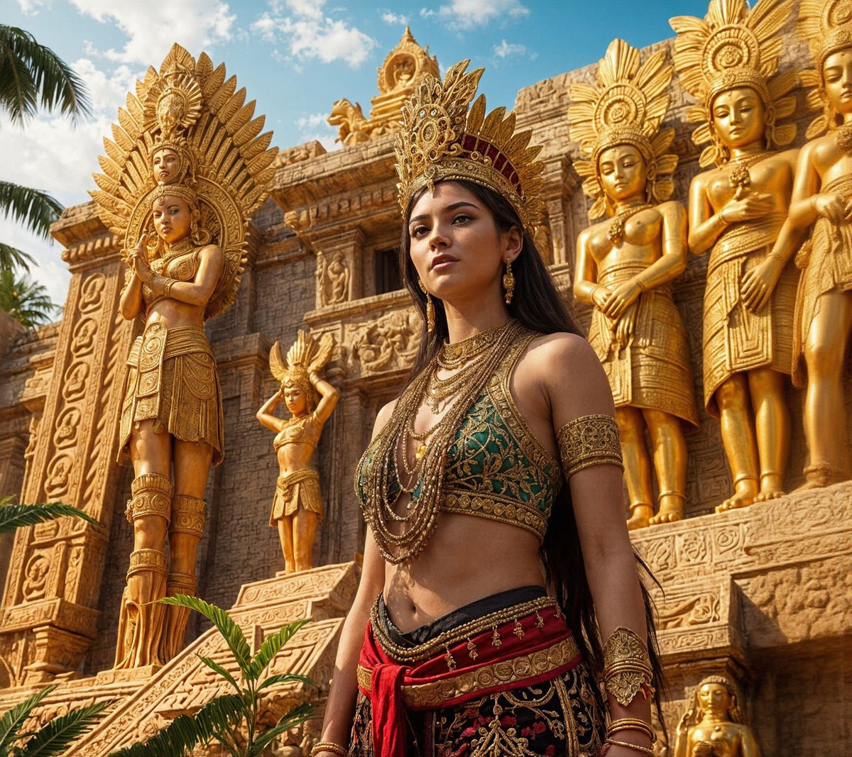 This hyperrealistic image shows a beautiful Maya princess adorned with intricate golden jewelry and clothing, standing before a detailed Maya temple with impressive golden statues under a warm sun.