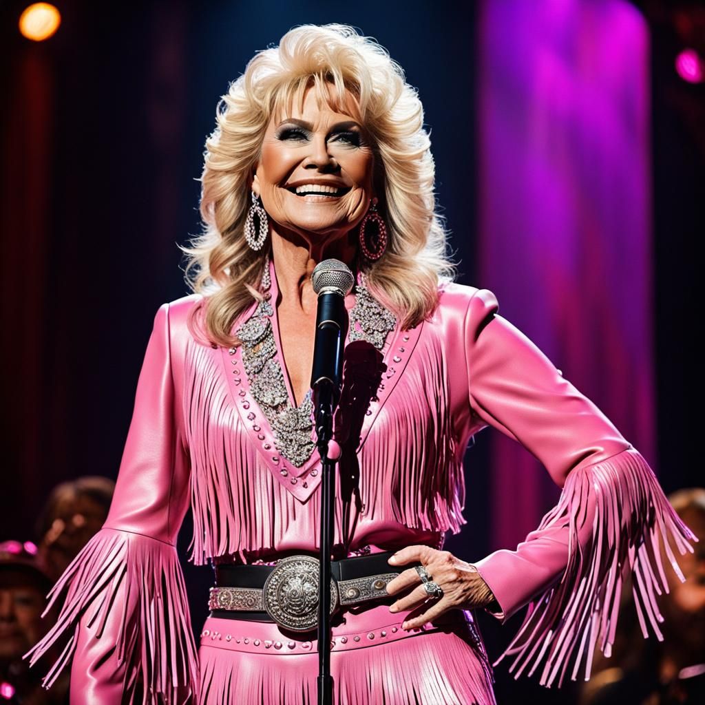A vibrant image of a country singer in pink fringe leather, performing on stage. Stage lights illuminate the singer, highlighting their warm smile in a detailed, colorful abstract style.