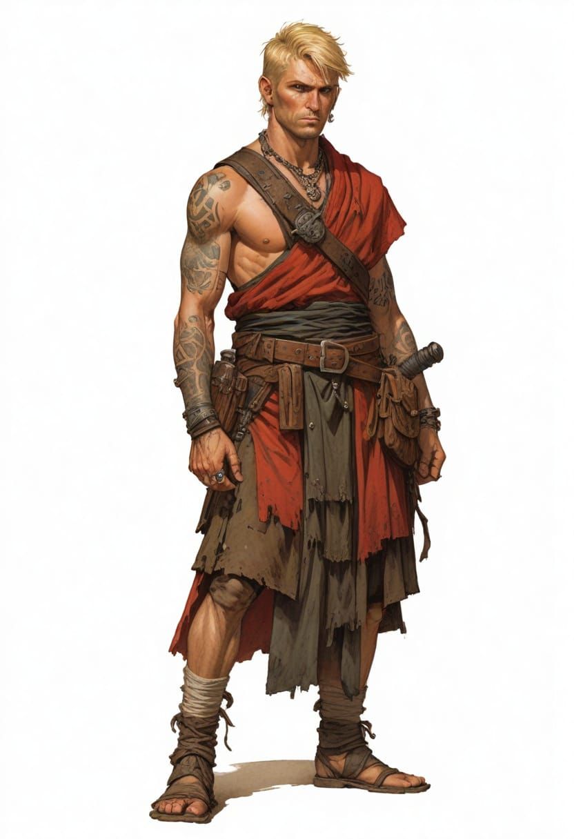 A highly detailed illustration of a blond, tattooed villager from the 10th century in a dynamic pose. The RPG character wears a ragged kilt and is rendered in vivid colors with black outlining.