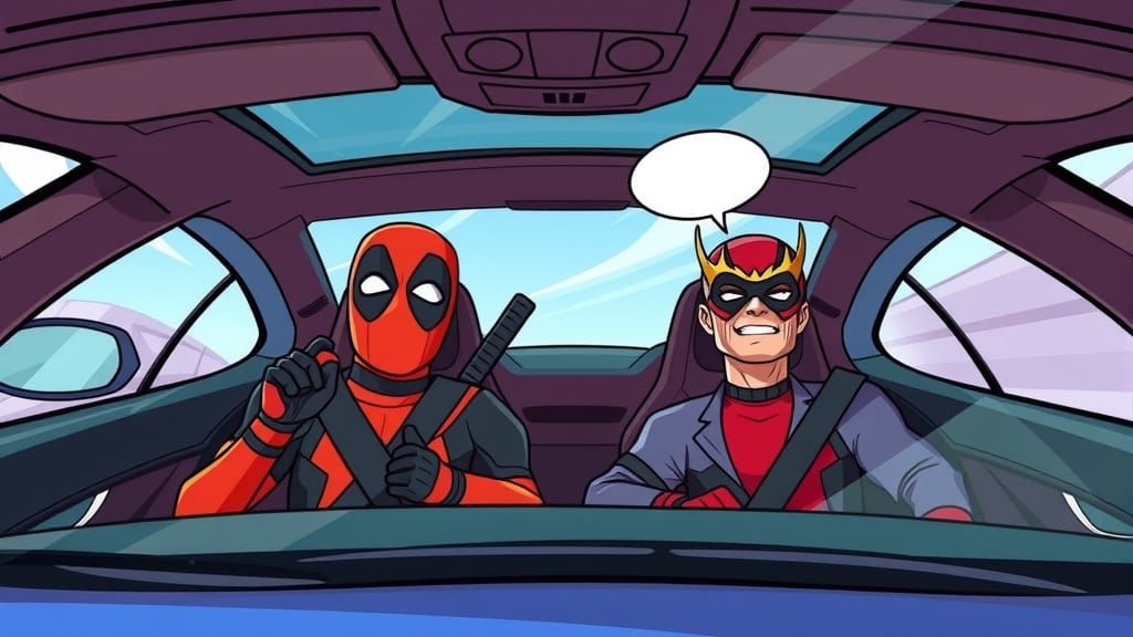 This image shows Deadpool and The Mask singing in a luxury sports car. The cartoon scene is full of vibrant colors, motion lines, and speech bubbles to enhance the humor.