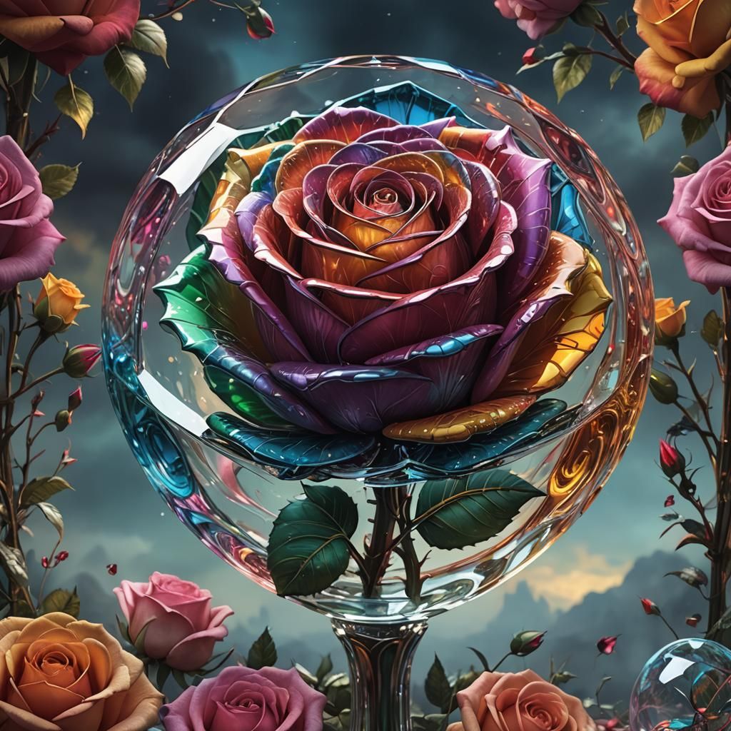 A vibrant glass rose shimmers with intricate detail. This digital matte painting captures the delicate beauty of the flower with stunning clarity and a dramatic, cinematic atmosphere.
