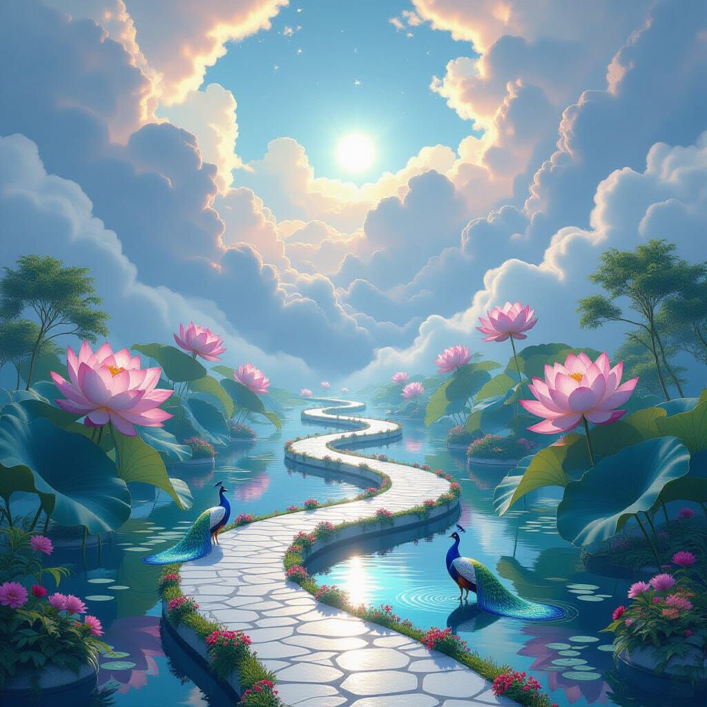 A mesmerizing garden floats among clouds. Giant lotus flowers bloom on misty ponds, with winding stone paths and iridescent peacocks dancing in the luminescent air, in a dreamy, vibrant style.
