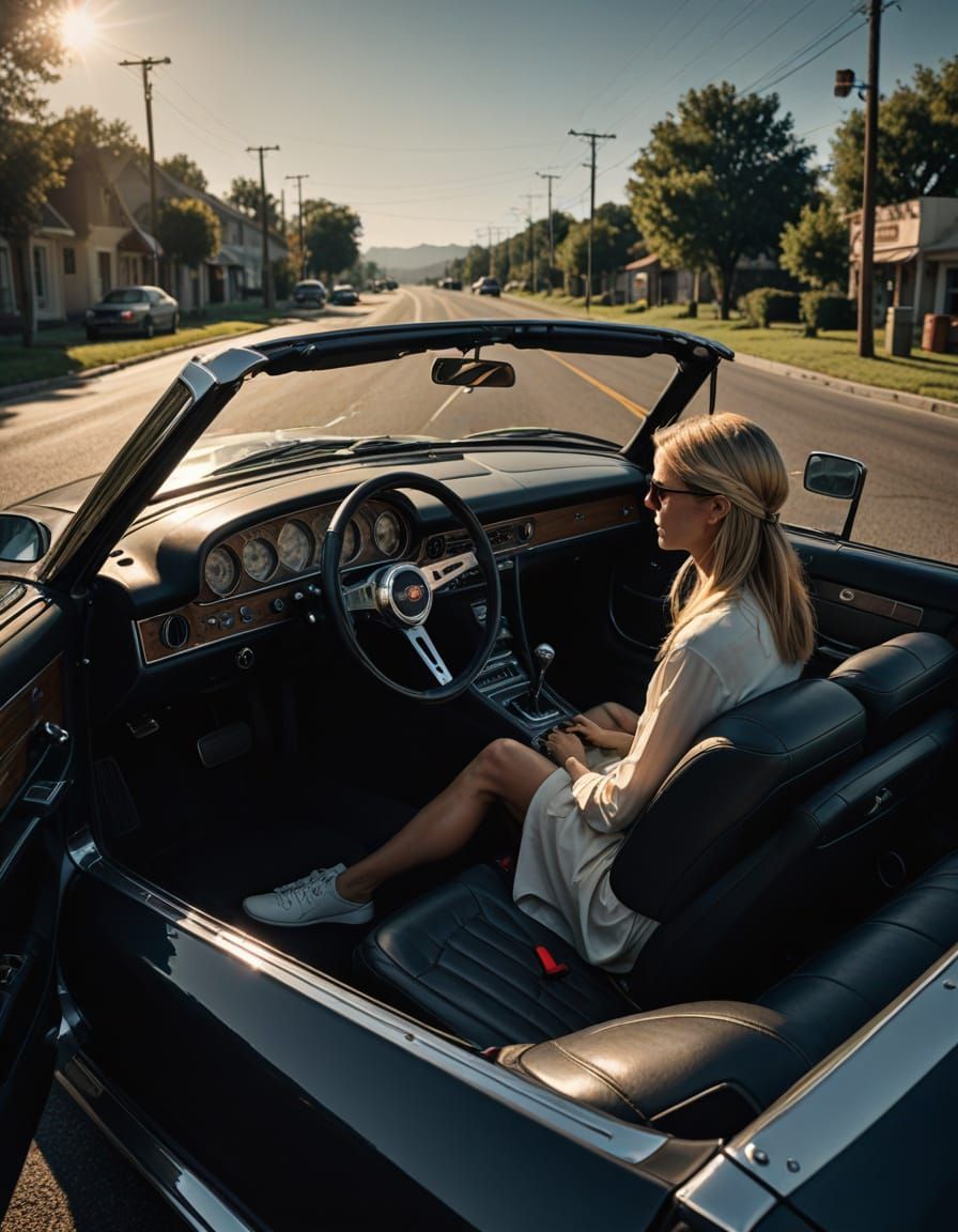 This image shows a hyperrealistic shot of a woman driving a convertible, with a focus on her profile and the car's interior details, set against a warm and moody background with subtle texture and high contrast.