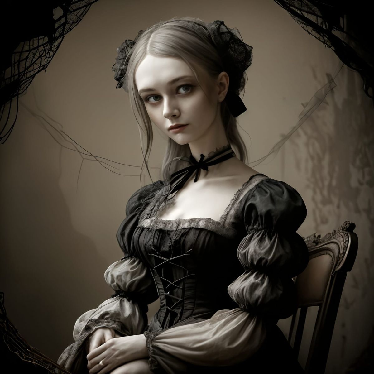 A fine art image of a cracked porcelain doll in a tattered Victorian gown, seated in a moonlit attic. Rendered in a classical oil painting style with dramatic lighting for an unsettling mood.
