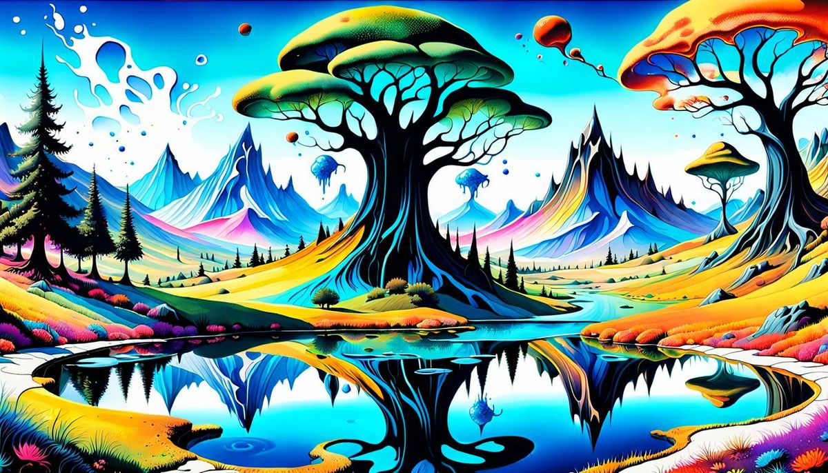 A vibrant panoramic vista of a surreal fantasyland. Mythical creatures play in a meadow beneath twisted trees, set against distant mountains. The scene features dreamlike elements, melting forms and blended colors.